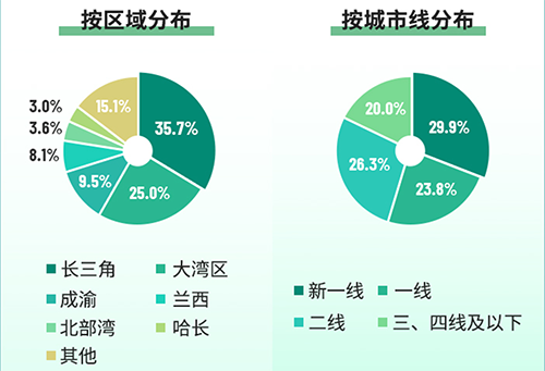 截至2020年12月31日,集團(tuán)在管項目達(dá)到2877個,覆蓋全國31個省、直轄市和自治區(qū),163座城市。在管面積的35.7%位于長三角城市群,25.0%位于粵港澳大灣區(qū),9.5%位于成渝城市群,8.1%位于蘭西城市群,3.6%位于北部灣城市群,3.0%位于哈長城市群,其余分布于中國其他區(qū)域。按城市線分布,新一線29.9%,一線23.8%,二線26.3%,三四線及以下20%。