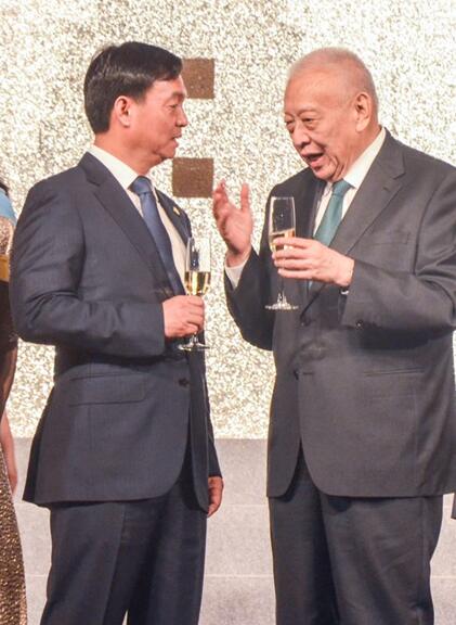 全國政協(xié)副主席董建華(右)與雅居樂集團(tuán)主席陳卓林交流