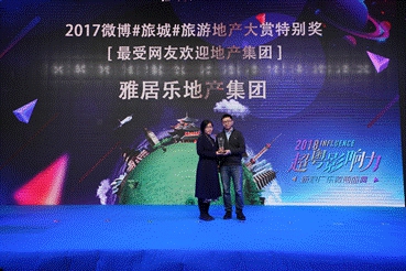 雅居樂地產(chǎn)獲“微博十大地產(chǎn)品牌影響力大獎”與“2017微博#旅城#旅游地產(chǎn)大賞特別獎最受網(wǎng)友歡迎地產(chǎn)集團”雙項大獎。這不僅是諸多業(yè)內(nèi)專業(yè)人士對雅居樂的肯定,也是眾多微博網(wǎng)友長期以來的支持。